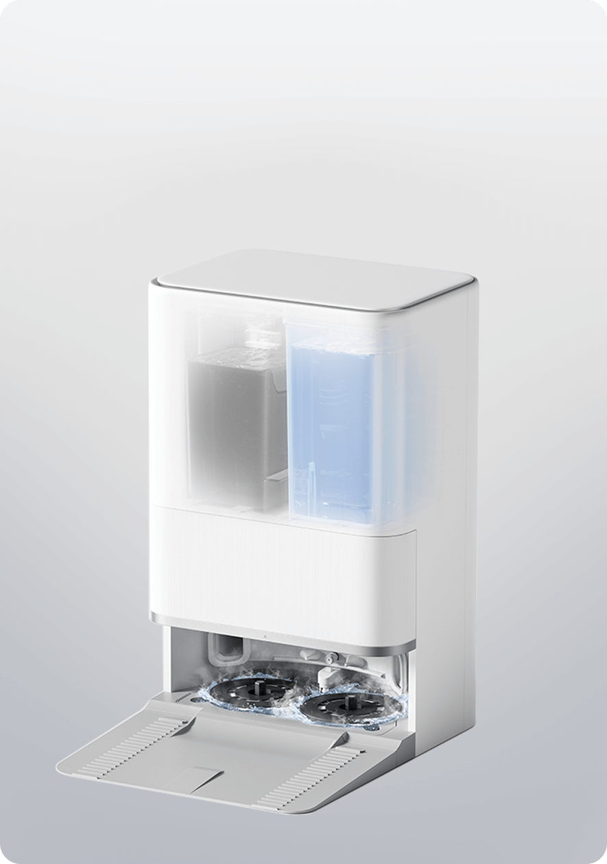 С двойни въртящи се стъргалки, базовата станция може да се справи не само със събирането на прах и почистването на подложките за моп; тя също така остъргва и почиства дъската за миене по време на измиване на мопа, намалявайки нуждата от честа ръчна поддръжка.13