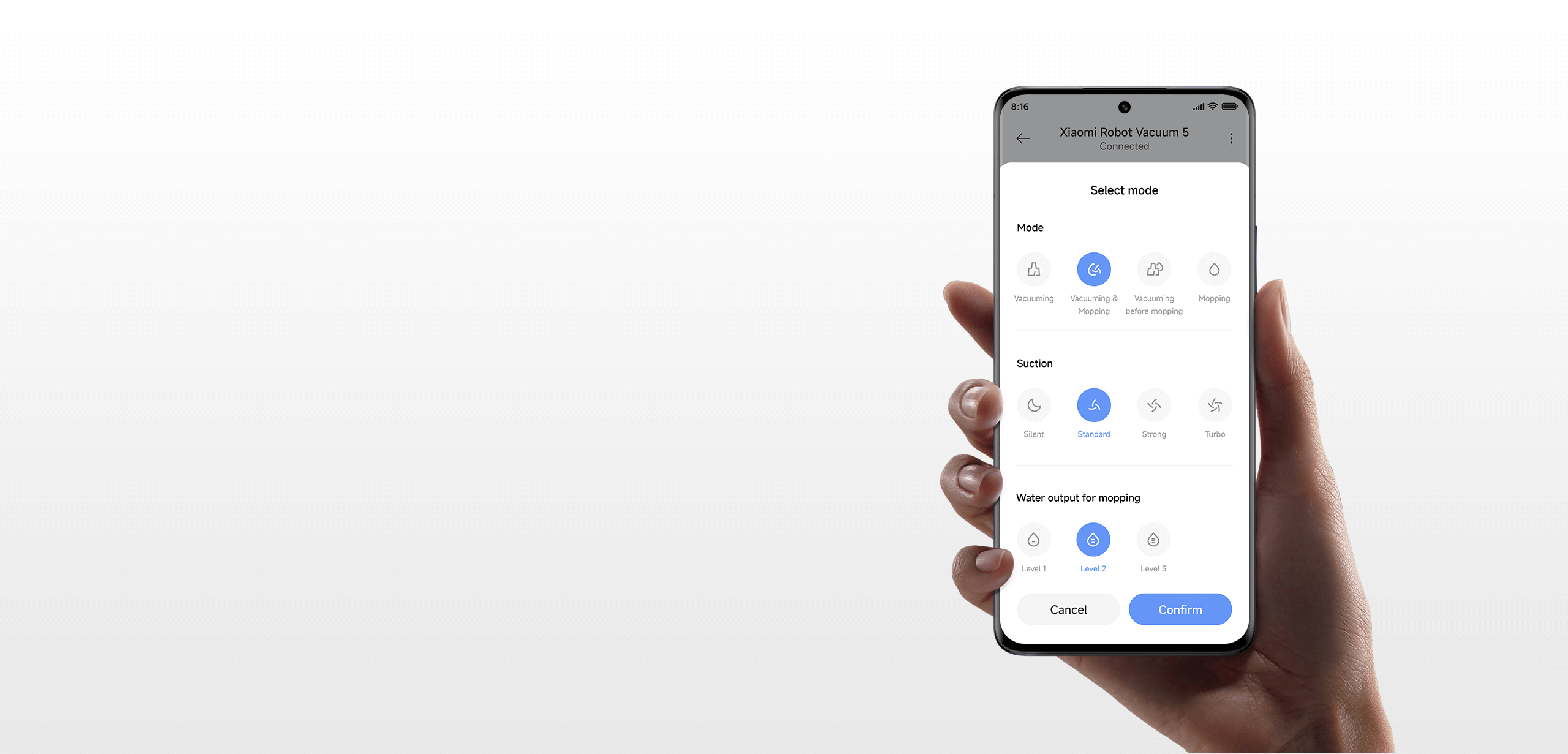 Когато сте далеч от дома, просто отворете приложението Xiaomi Home. То поддържа дистанционно стартиране на прахосмукачка и мокро почистване, както и персонализирани функции, като например планирано почистване и задаване на зони, в които е забранено да се ходи. Почистете дома си от дланта си.