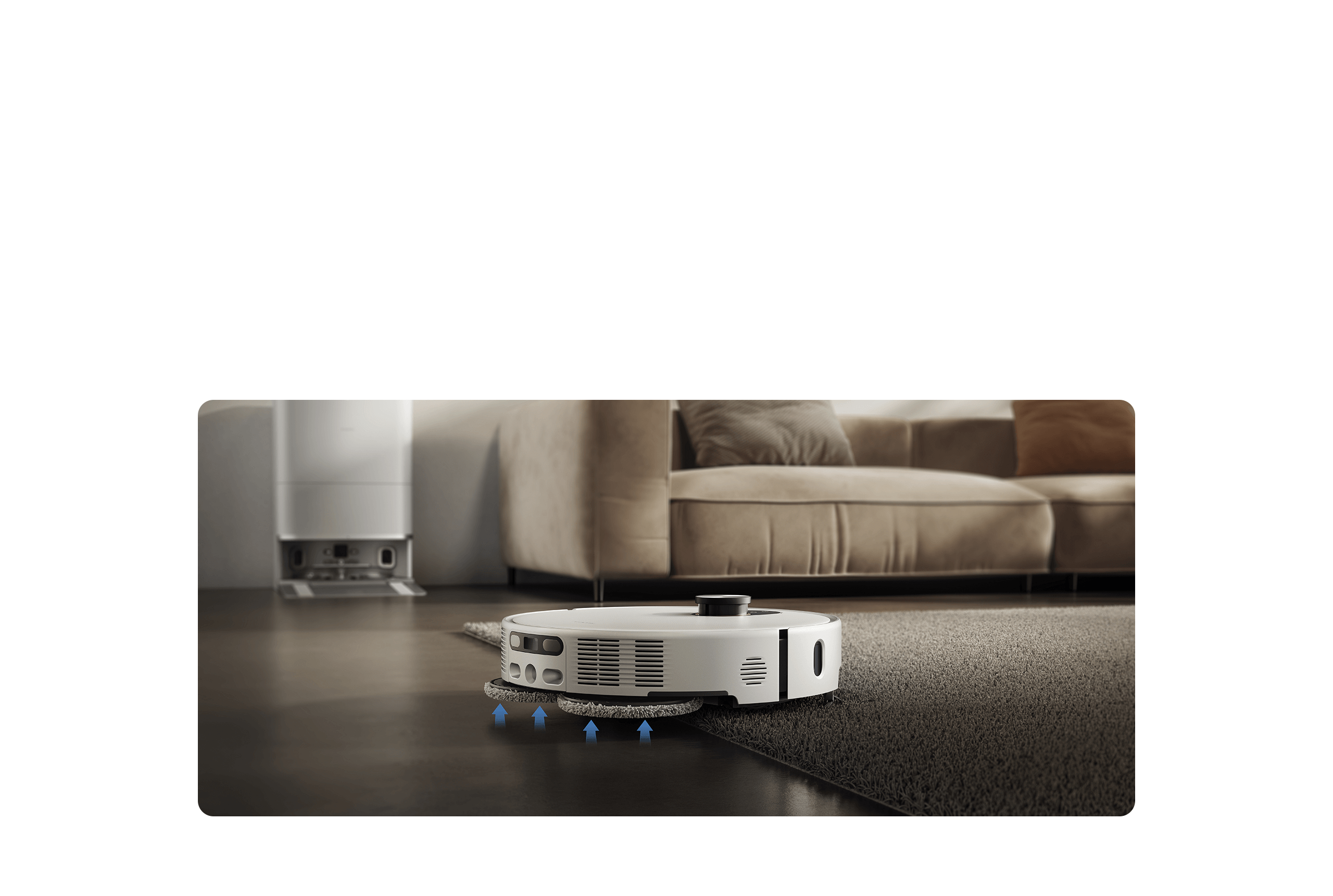 Интелигентната прибираща се странична четка и подложката за моп се издърпват автоматично, почиствайки прах по стените и в ъглите с прецизност до милиметър. В комбинация с отделния резервоар за вода на роботизираната прахосмукачка и прецизния контрол на дебита на водата, подовете остават искрящо чисти.