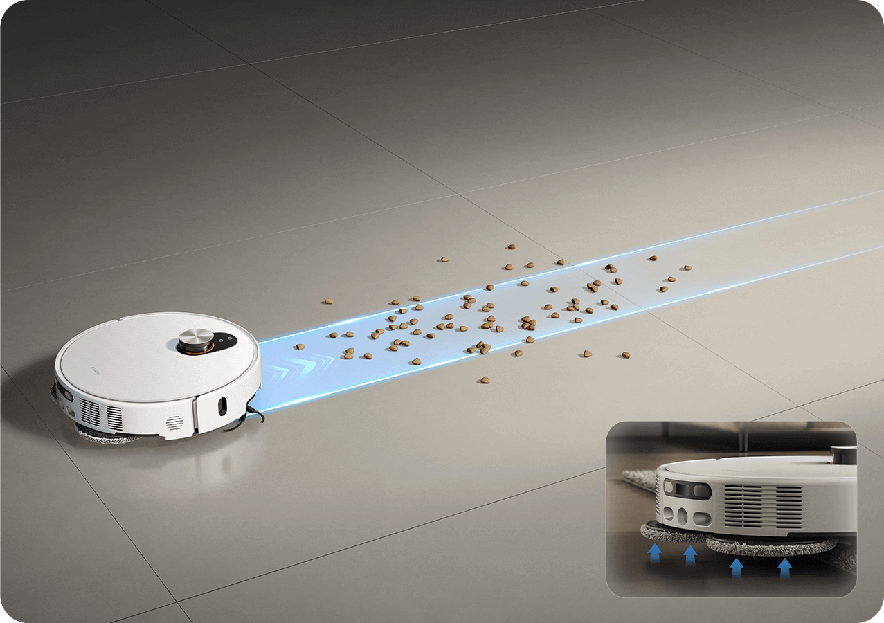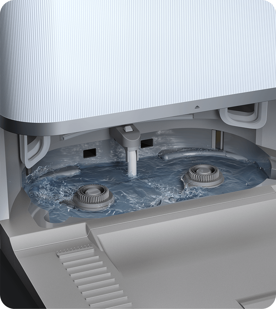 Разтегателният моп и страничната четка се изтеглят автоматично, за да се постигне милиметрово почистване на прах по ръбовете и ъглите. В комбинация с отделен резервоар за вода и прецизен контрол на изхода на вода, прахосмукачката-робот оставя подовете искрящо чисти.