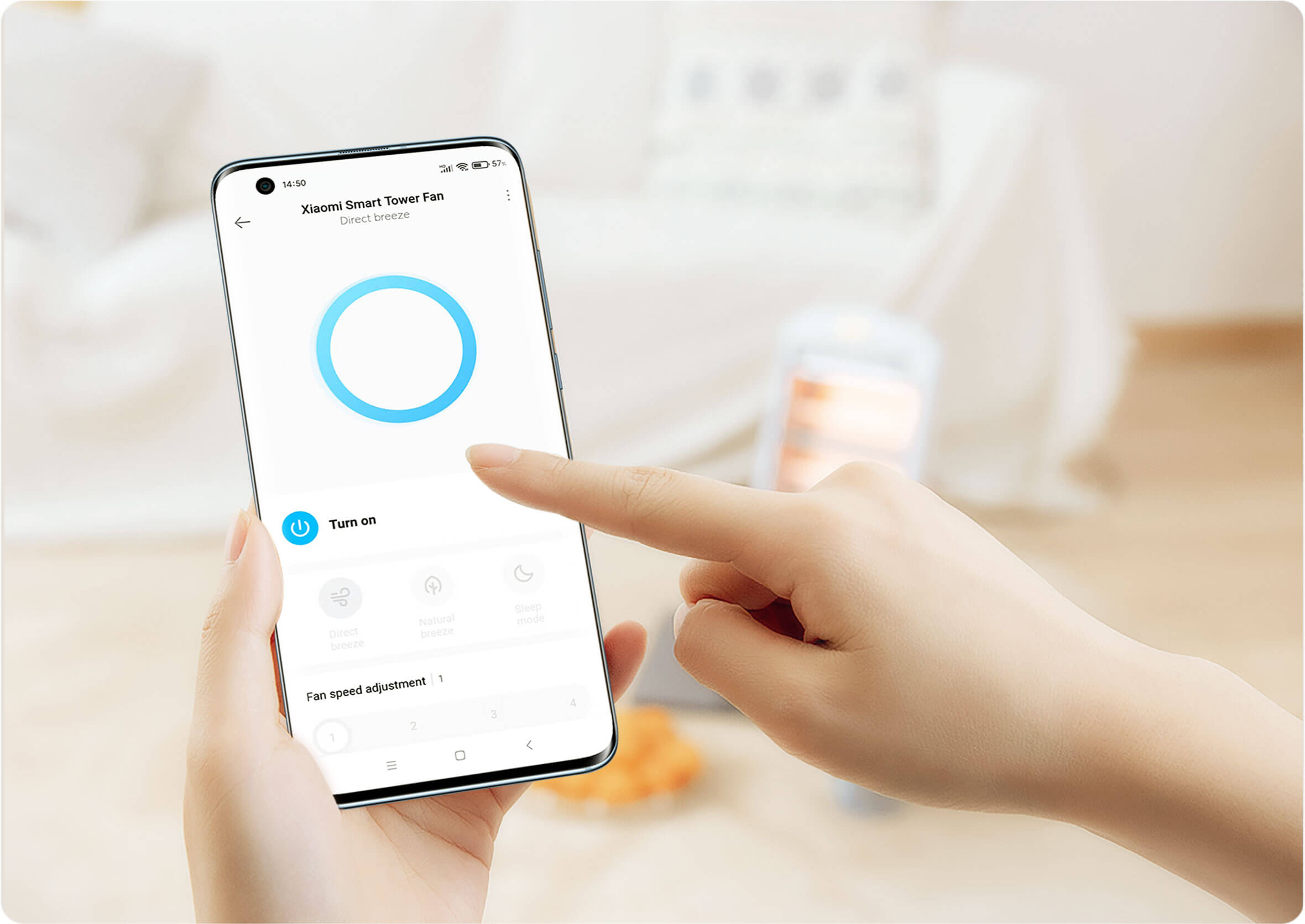 За студения летен период са достатъчни само 3,48 kWh. С изходна мощност от само 3,5 W, вентилаторът консумира само 3,48 kWh* енергия през прохладното лято, а когато работи в продължение на 6 дни на най-високо ниво на звука, консумира само 1,19 kWh*.Интелигентен гласов контрол. С помощта на Google Assistant и високоговорителя Alexa можете да включите вентилатора и да регулирате скоростта с проста гласова команда.