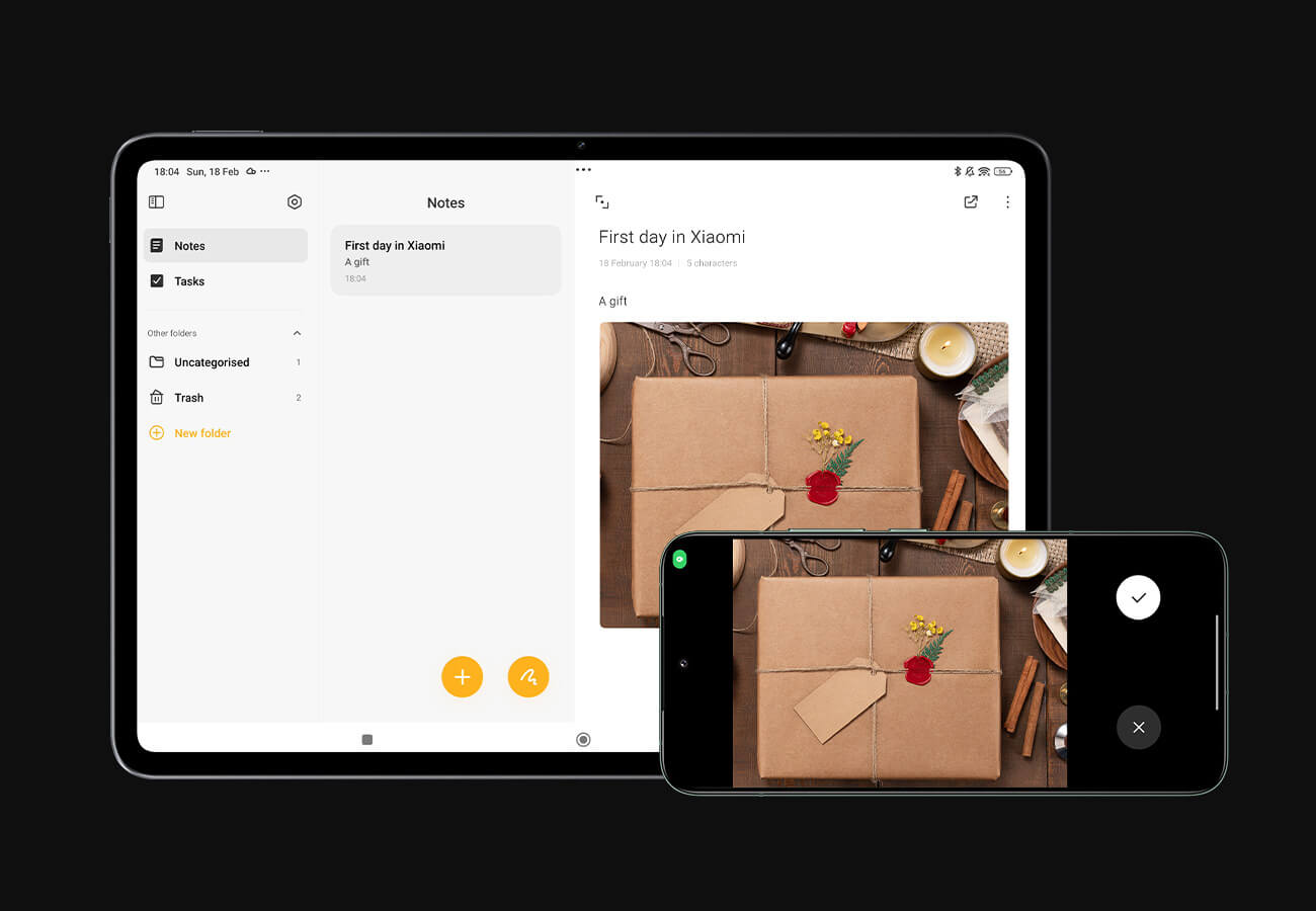 Поддържа NFC тагове. Докоснете NFC зоната на таблета със своя смартфон, за да прехвърлите бързо снимки от вашата галерия и файлове от вашия файлов мениджър. Това е просто и ефективно. *Ако акаунтите на Xiaomi на вашите устройства са различни, първо трябва да активирате Xiaomi Share.
